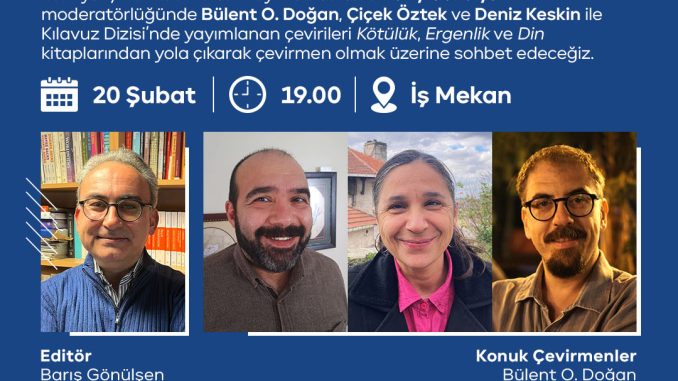 Gençlere, öğrencilere ve genel okuyucu kitlesine yönelik, kolay okunur başvuru kitaplarının yer aldığı Kılavuz Dizisi’nin çevirmenlerinden Bülent O. Doğan, Çiçek Öztek ve Deniz Keskin, editör Barış Gönülşen moderatörlüğünde, bu diziden yola çıkarak kendi çevirmenlik serüvenleri üzerine konuşacak. Uzun yıllara dayanan tecrübelerini paylaşacak ve bu dizideki kitapların çeviri sürecinde edindikleri deneyimleri aktaracak olan çevirmenler, farklı kültürler arasında köprü kurmanın inceliklerini de anlatacaklar.